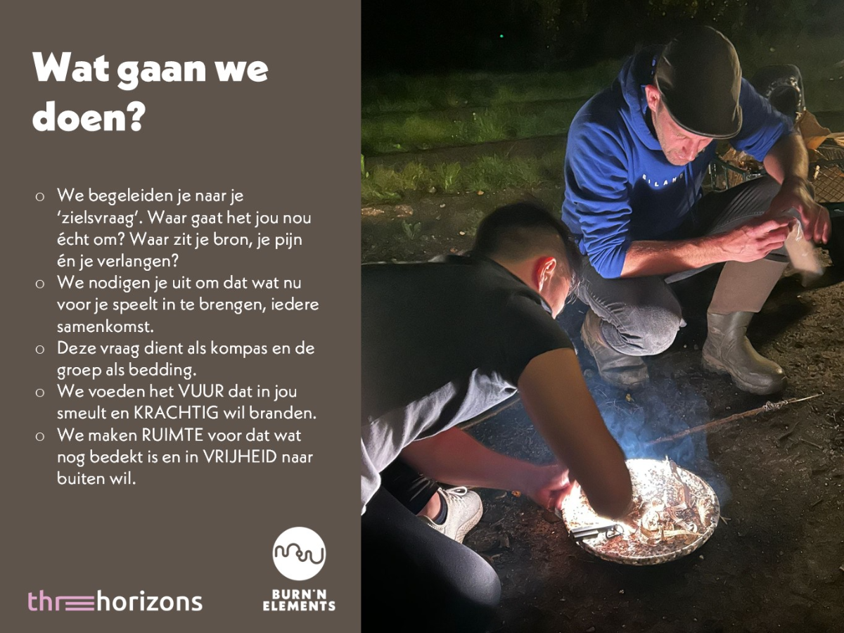 Een vaste groep van max. 8 mannen, komt zes dagen bij elkaar. Elke middag en avond samen werken en eten aan het vuur en één worden met de elementen (weer, windrichtingen en maan). We doorleven samen de seizoenen en hervinden ons man-zijn.